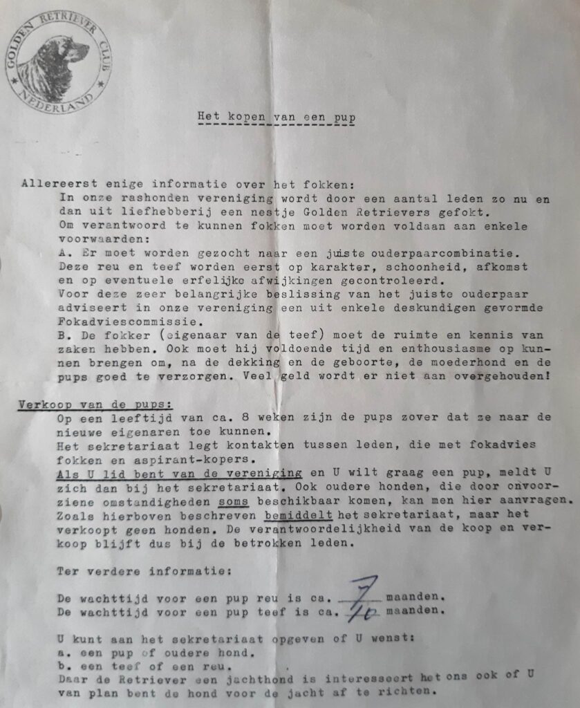 Na aanmelding bij mevrouw Greet van Rhijn-Zuur, destijds secretaresse van de Golden Retriever Club Nederland en spil van de pupbemiddeling kreeg ik o.a. onderstaande papieren.